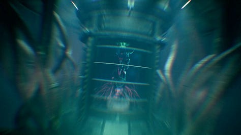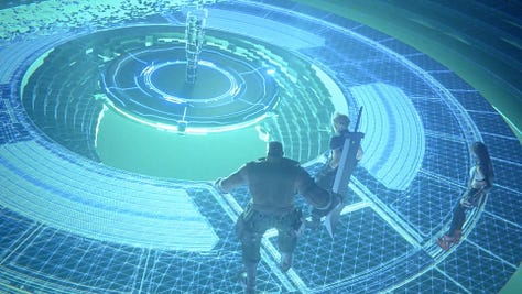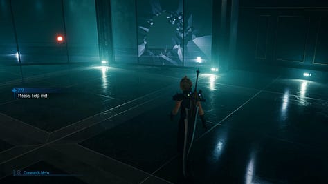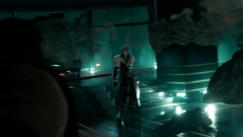 Anyway, Cloud tries to follow Sephiroth to the top but is blocked off by Whispers, who need to make sure that Jenova can escape unencumbered. But that’s not the important part of this scene. First, we see this brief green glitch effect when Sephiroth looks towards and acknowledges Cloud. This effect usually accompanies suppression, alteration, or hurtful recollection of memories.