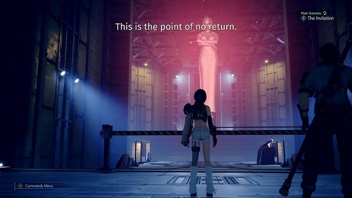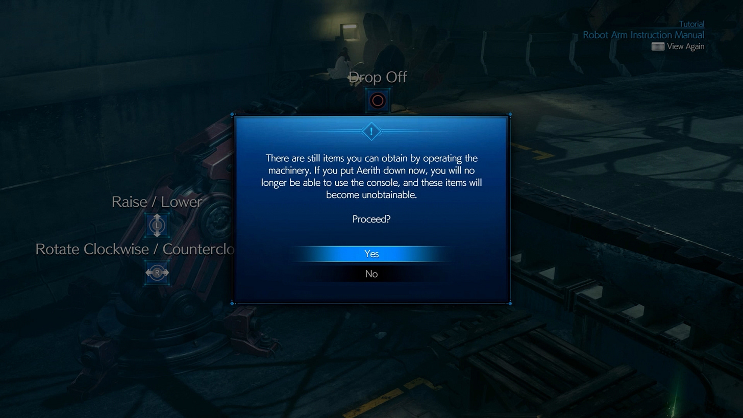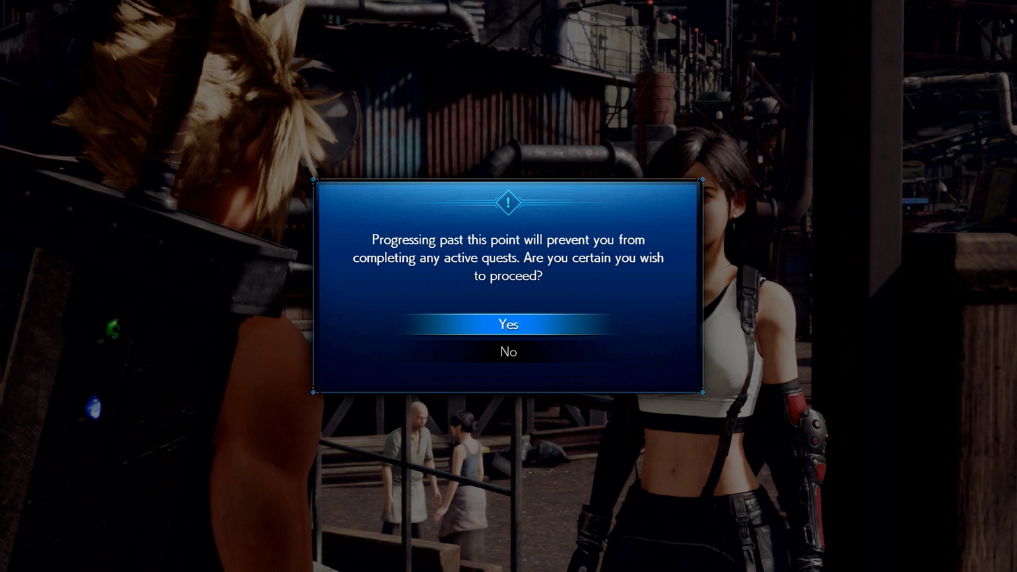 To be fair, the game will provide you with a warning message if you don’t pick up the optional Materia treasure in chapter 9’s collapsed expressway, though in this case, it’s just a message and not an in-lore conversation.