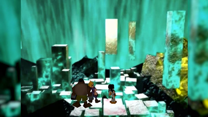 Now pay attention to the shapes beyond the battlefield: the green cuboid pillars. Where have we seen those before…? The ground on which we fight also shows a lot of squares, similar to Jenova Synthesis’ battle arena.