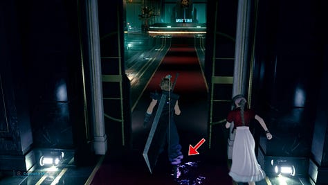 Now, why didn’t Sephiroth kill the president and leave right away like he did in the original? He reached the office before the others after all. What’s also strange is that the purple trail of alien goo just stops at the entrance to the office. To be fair, the trail of blood is also missing on floor 70 in the original.