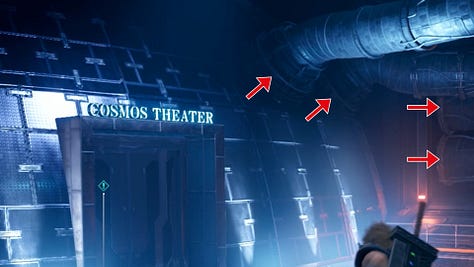 The next Sephiroth appearance and memory glitch happen right after the spectacular Cosmos Theater presentation in the Shinra building’s Visual Entertainment Hall on floor 61, where we experience the history of the Ancients. The Shinra logo appears to mark the end of the presentation. However, just as the lights go back on, purple glitches appear in 3D space around them, forming the image of a street on Midgar’s sector 4 plate.