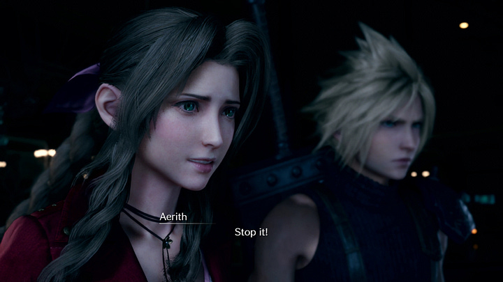This scene is entirely new and reveals a tiny bit more of Cloud’s past. Naturally, his messed-up mind suppresses this memory immediately as he would otherwise remember his past as a Shinra infantryman in Nibelheim five years ago and not as a SOLDIER, as he currently believes. The track which starts playing here is also very fitting. It’s the Remake’s version of “Who Are You?” In the original game, it plays in the &$#% room in Honeybee Inn, when Cloud looks at Jenova in the Shinra building, before waking up in Lower Junon, and when Tifa wakes from her seven-day coma in Junon. Each time it’s connected to Cloud’s repressed past and the person talking to the protagonist is unknown.
