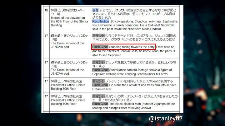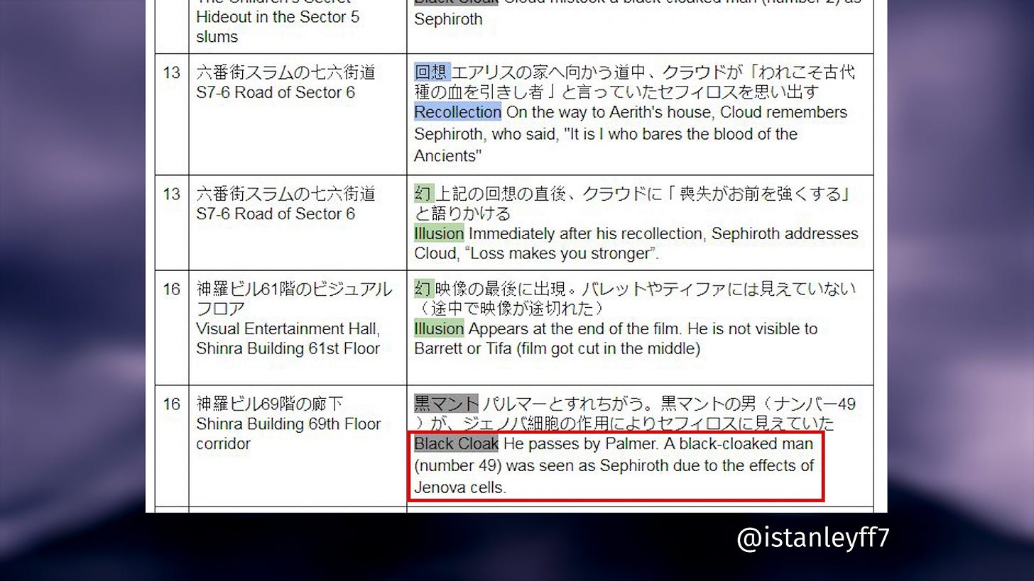 What we believe the real message in this presentation to be is rather subtle and can probably only be decoded by those familiar with the whole story. Notice that the black-robed man doesn’t show a number and the Jenova symbol on his back is halfway faded away, two distinct differences from numbers 2 and 49 as well as numbers 11, 16, and 20 from Episode INTERmission.