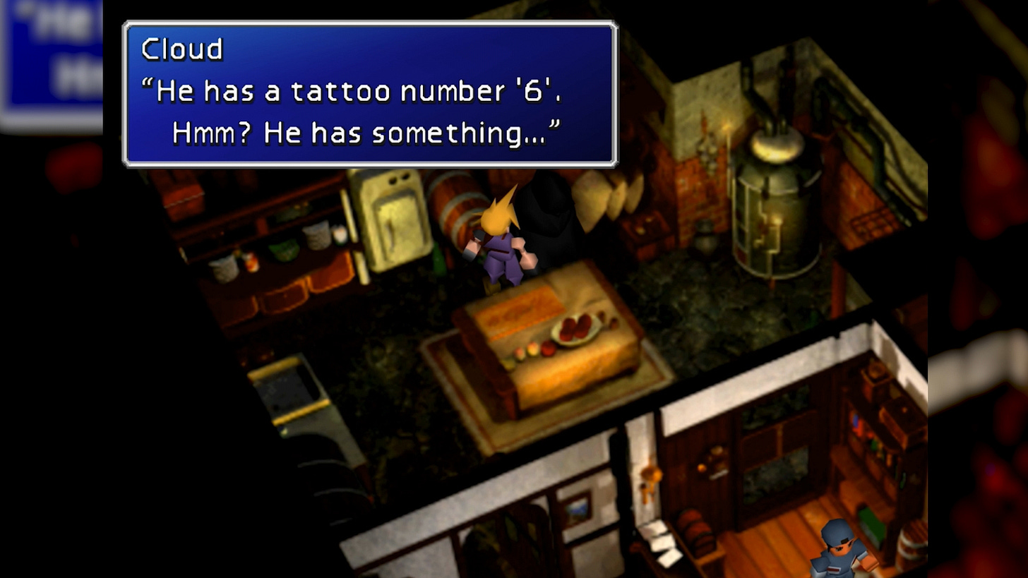 Anyway, back to Palmer, who is lamenting about missing the lard in his precious tea when he suddenly drops both cup and saucer after seeing a ghost, or so he thinks. For the first time, somebody else besides Cloud is able to see Sephiroth as if he really existed, which shouldn’t be possible. But it is and here’s why. Remember the two black-robed men with the numbers 2 and 49 tattooed on their left shoulder? One of them made it all the way up here and now appears as Sephiroth thanks to the illusory abilities of Jenova cells. The Ultimania confirms this fact and even tells us that it’s Marco we see here, number 49.