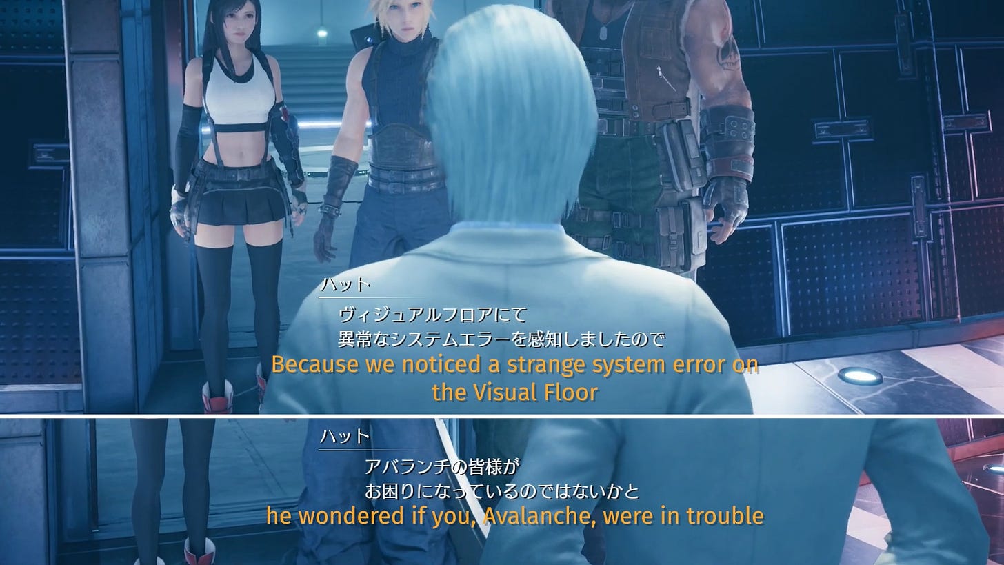 This suggests that those technical difficulties started recently but also happened before this incident just now, which is wrong. In the Japanese version, he says the following: “Because we noticed a strange system error on the Visual Floor, he wondered if you, Avalanche, were in trouble.”
