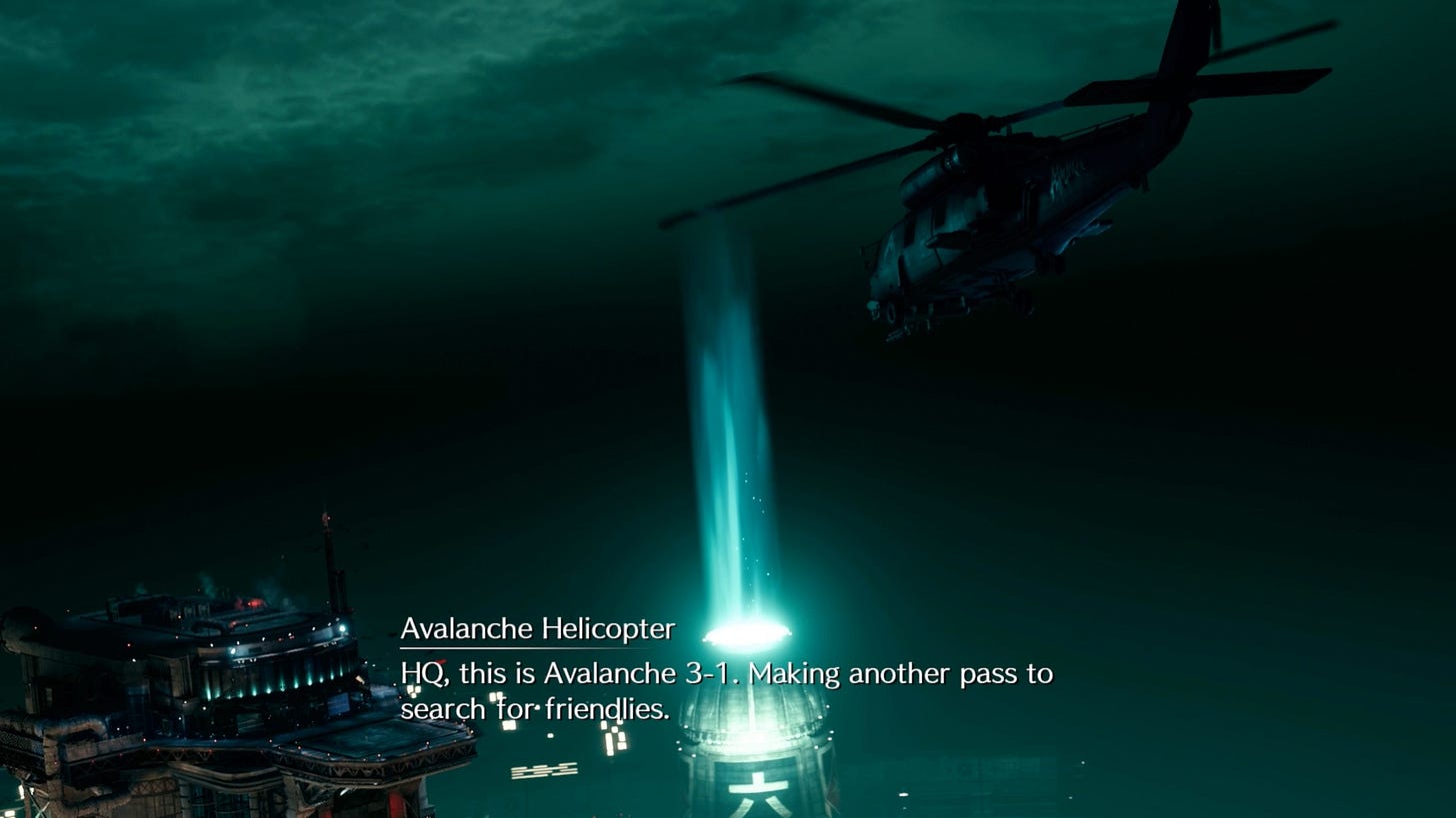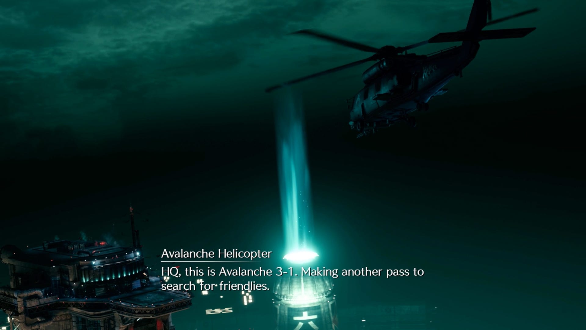 But why, then, is nobody around when we enter the president’s office? And why is president Shinra dangling from the safety grate around the helipad? The Avalanche helicopter coming our way is doing so a second time! The same one has been there before already, most likely to evacuate friendlies after accomplishing their mission of flushing out the president.